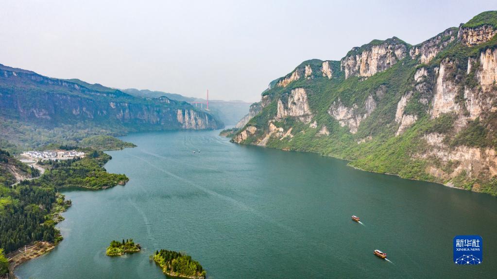 游船行駛在貴州省黔西市新仁苗族鄉(xiāng)化屋村旁的烏江源百里畫廊景區(qū)(2021年4月1日攝,無人機照片)。新華社記者 陶亮 攝