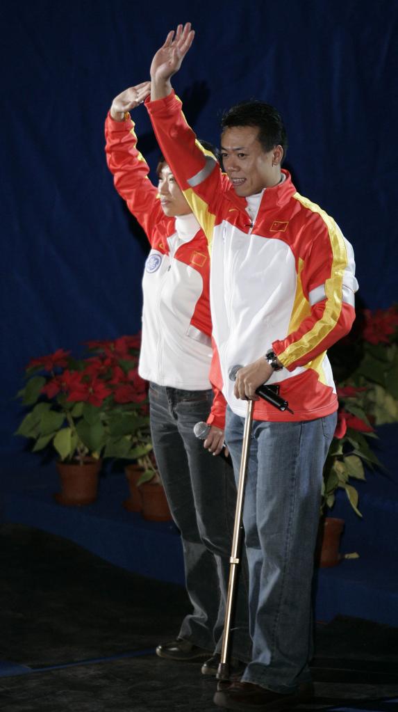 2005年11月6日,2005世界花滑大獎(jiǎng)賽(中國(guó)站)在北京閉幕,花樣滑冰世界冠軍申雪(左)和趙宏博在首都體育館向觀眾致意。此時(shí)的趙宏博需要拐杖支撐行動(dòng)。新華社記者攝