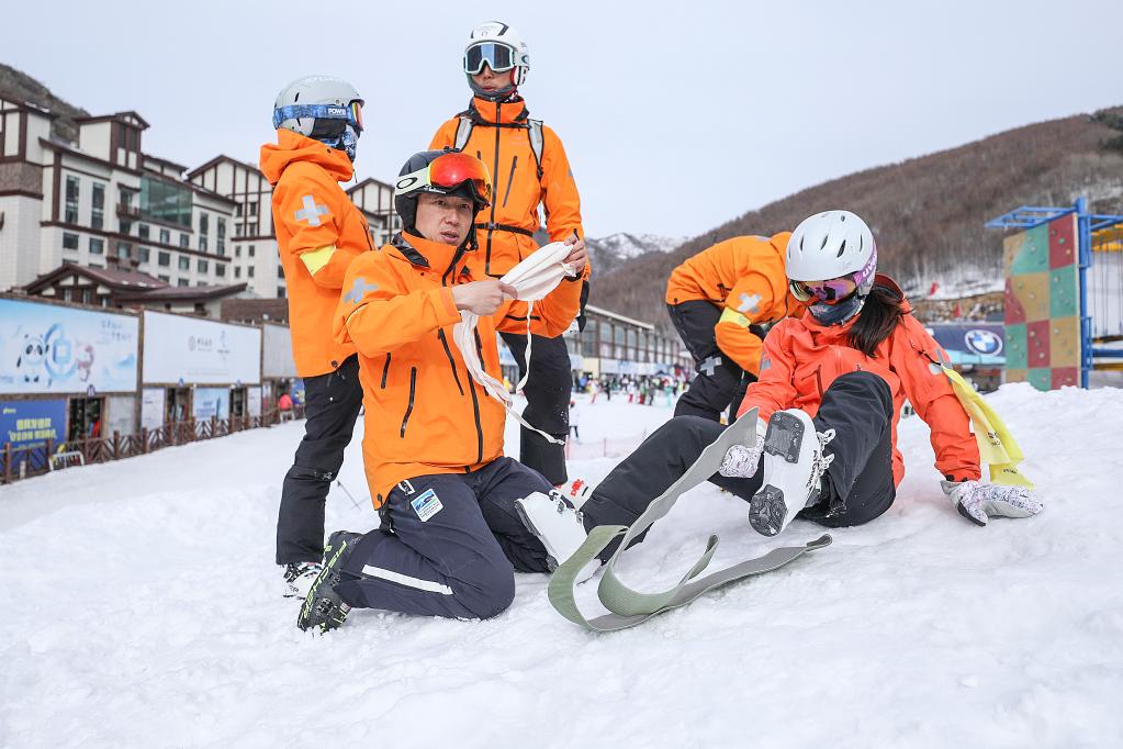 2021年3月13日,由北醫(yī)三院醫(yī)生組成的國(guó)家高山滑雪中心醫(yī)療隊(duì)在崇禮參加雪地救援培訓(xùn)。新華社記者張玉薇攝