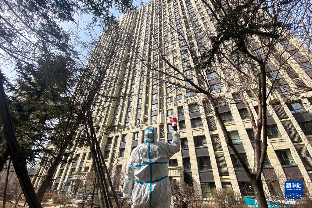 在吉林省長春市一處管控小區(qū)內(nèi),防疫工作人員用喇叭提醒居民下樓接受核酸采樣(3月25日攝)。新華社記者 許暢 攝