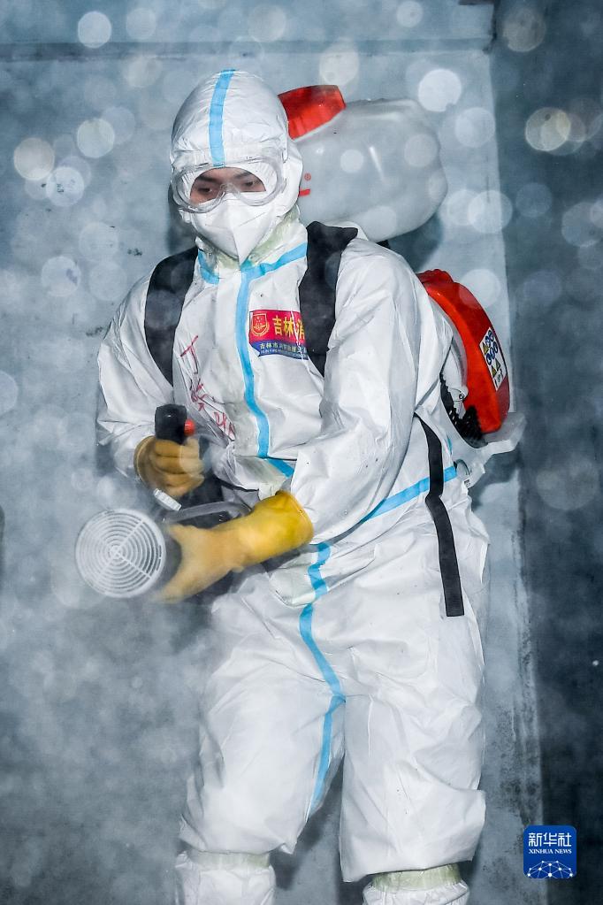 吉林省吉林市消防救援支隊黨員先鋒突擊隊隊員丁乾濤在居民樓內(nèi)進(jìn)行消殺作業(yè)(3月18日攝)。新華社記者 張楠 攝