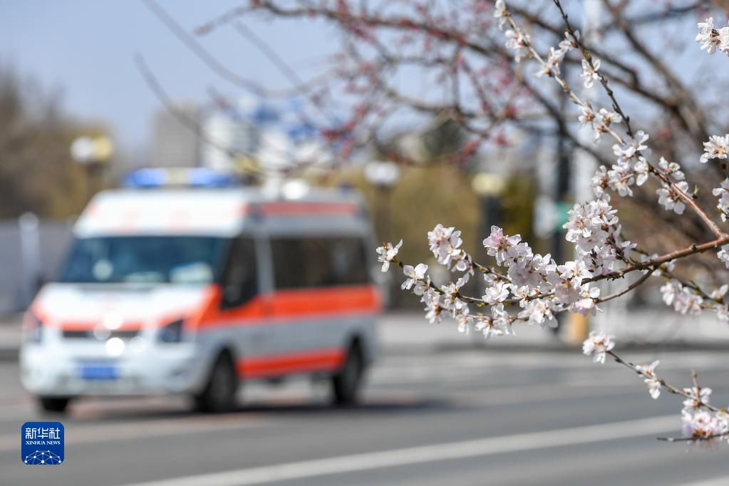 4月14日,一輛救護(hù)車在吉林省吉林市松江東路上駛過,路邊桃花已經(jīng)盛開。新華社記者 張楠 攝
