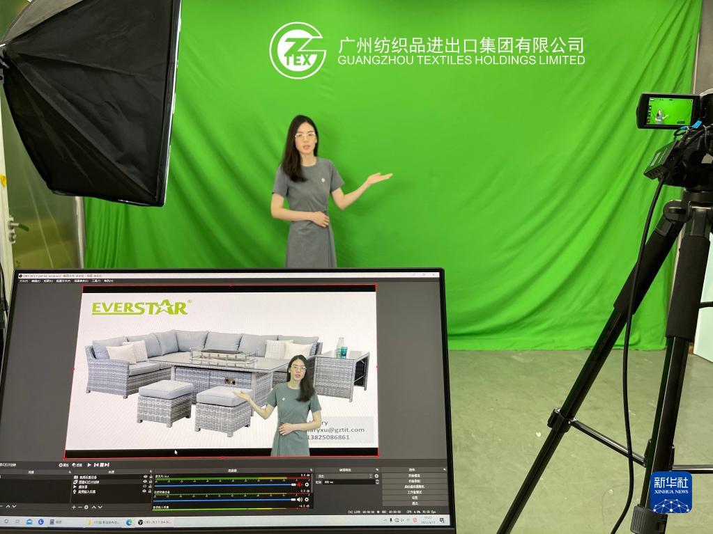 廣州輕工工貿集團紡織品進出口公司員工利用綠幕技術排練廣交會上“云展示”(4月11日攝)。新華社發(受訪者供圖)