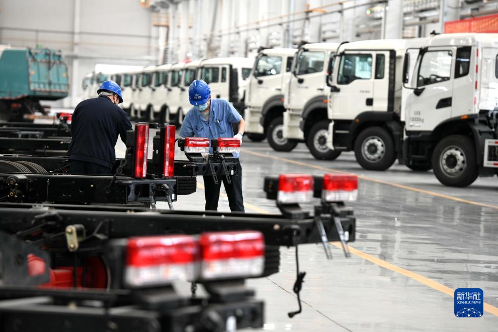 在位于石家莊市欒城區的石家莊煤礦機械有限責任公司車間內,工作人員組裝新能源環衛車(4月12日攝)。新華社記者 李繼偉 攝
