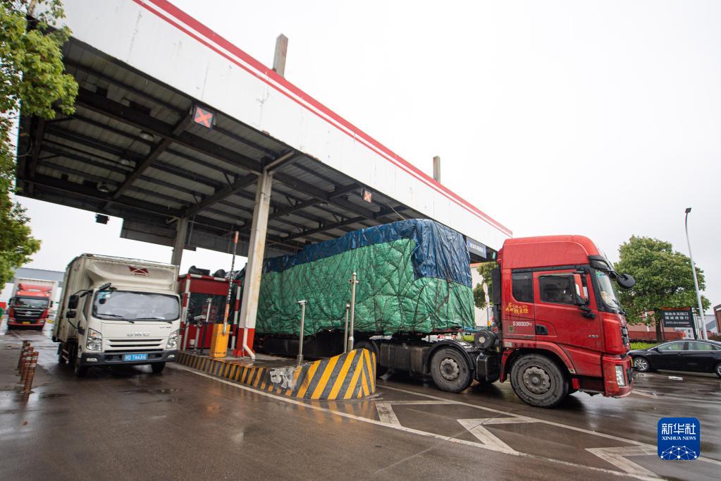 貨車駛入位于杭州市錢塘區的杭州傳化公路港(4月13日攝)。新華社記者 江漢 攝