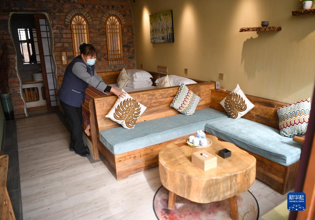 服務員在延安市寶塔區河莊坪鎮趙家岸村一家民宿內整理房間(3月30日攝)。新華社記者 邵瑞 攝