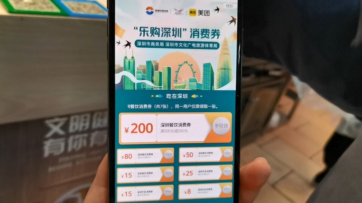 深圳自“五一”起,通過美團、京東等平臺陸續發放5億元消費券,涉及購物、餐飲、文體旅游、數字人民幣紅包等方面。(美團 供圖)