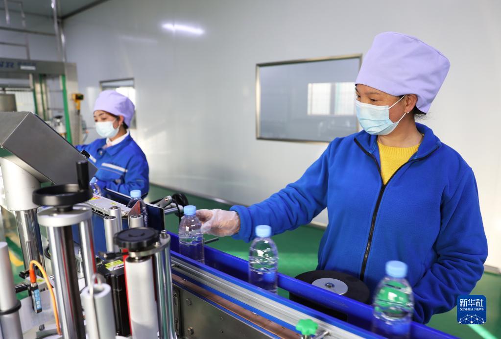 寧夏固原市涇源縣騰筠源飲品有限公司的工人在飲用水生產線上工作(4月20日攝)。該公司獲得用水權確權1.97萬方,以水定產的約束讓公司時刻緊繃節約用水意識。新華社記者 盧鷹 攝