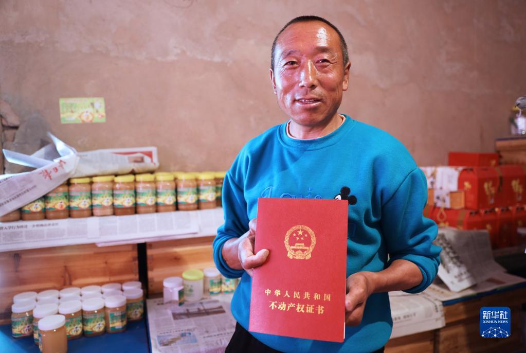 寧夏固原市彭陽縣米塬村蜂農米克宗展示山林權不動產權證書(4月20日攝)。新華社記者 盧鷹 攝