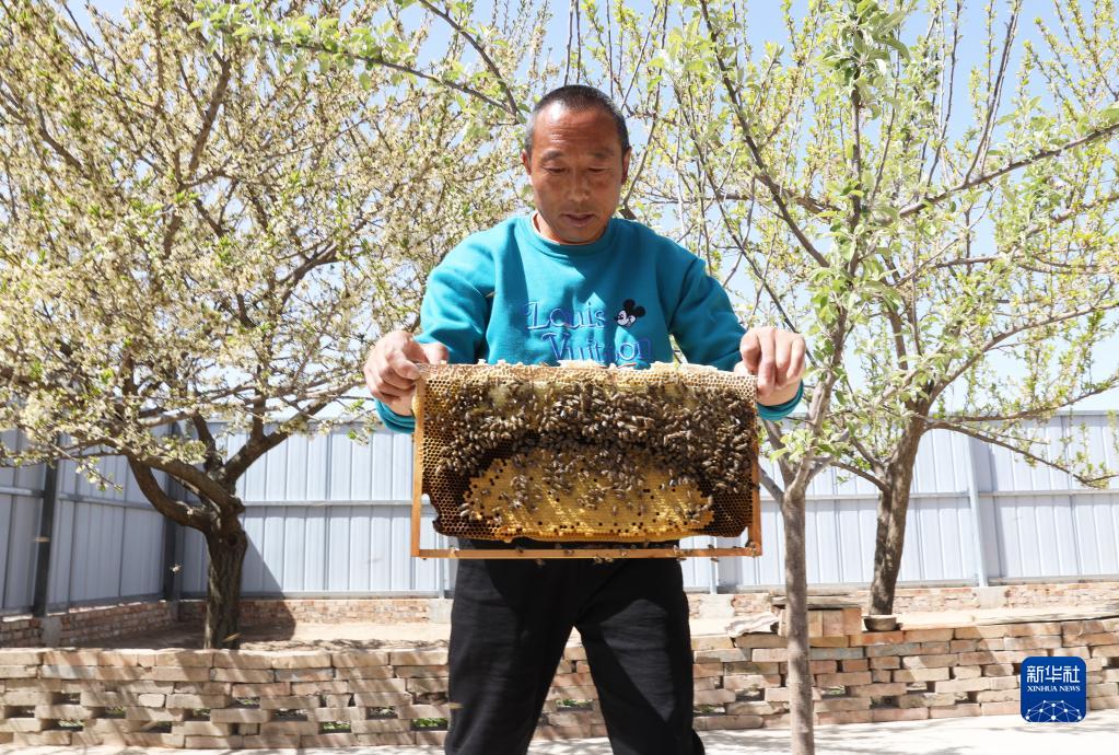 寧夏固原市彭陽縣米塬村蜂農米克宗在觀察自家養殖的蜜蜂(4月20日攝)。新華社記者 盧鷹 攝