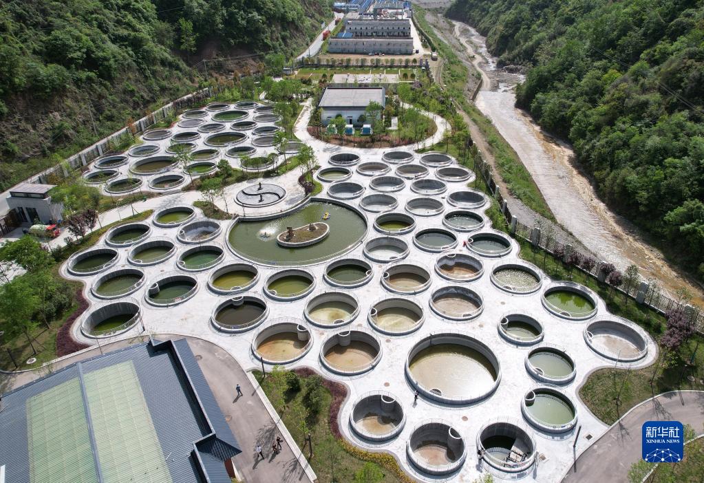 “引漢濟渭”黃金峽水利樞紐工程配套建設的魚類增殖放流站(4月19日攝,無人機照片)。新華社記者 邵瑞 攝