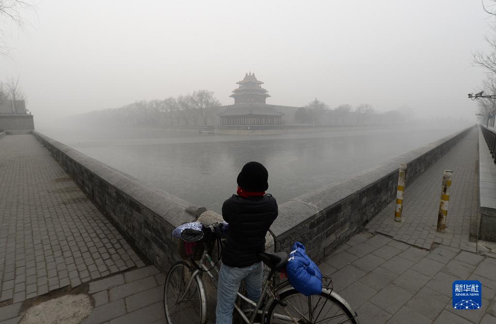 2015年12月25日,一名市民拍攝籠罩在霧霾中的北京故宮角樓。新華社記者 武巍 攝