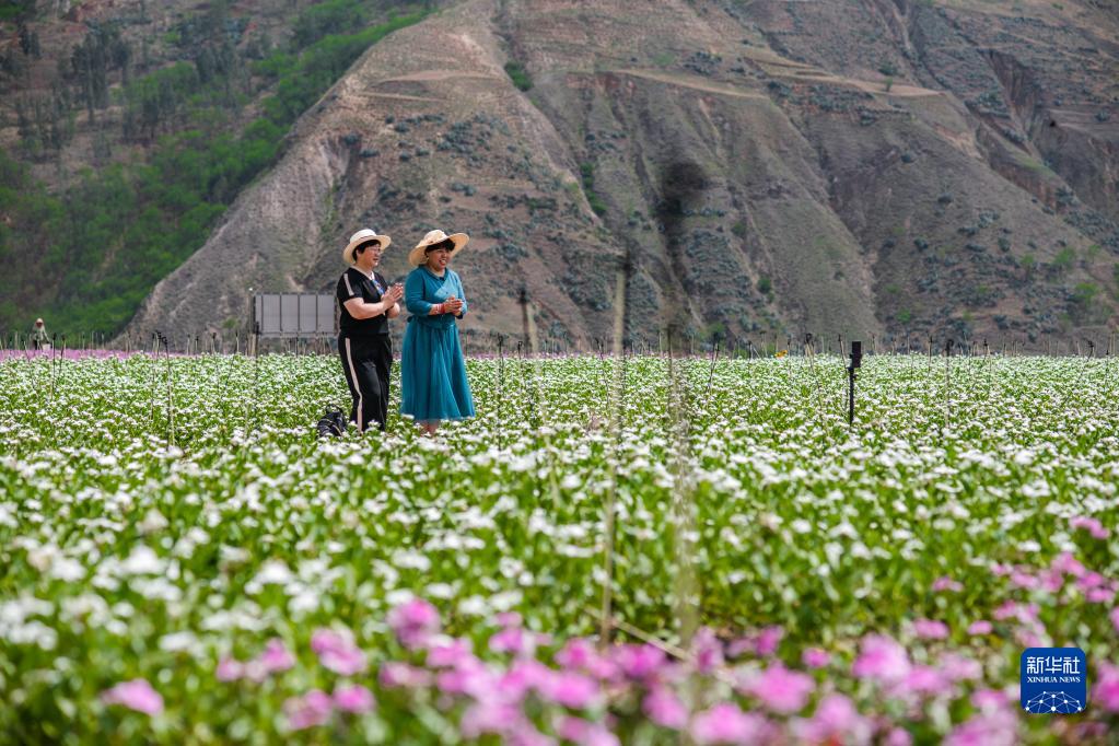 5月31日,游客在云南省昆明市東川區湯丹鎮小江四季花海參觀游玩。新華社記者 胡超 攝