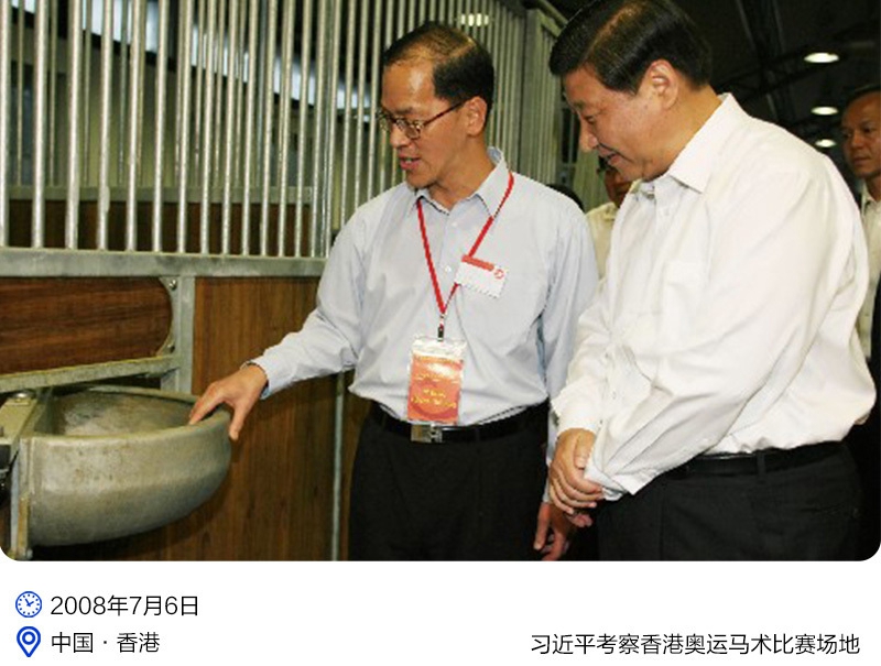 距離北京奧運會開幕還有30多天,時任國家副主席的習近平來到香港,實地考察北京奧運會、殘奧會馬術比賽籌辦情況,他贊揚香港僅用3年左右時間就建成了兩個高水平、現代化的奧運馬術賽場,“廣大香港同胞一定會在祖國體育事業發展史上創造新的輝煌”。