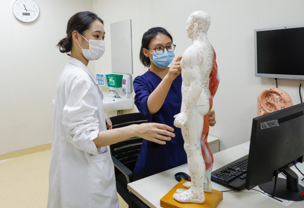 2022年6月30日,醫護人員在改造后的中國中醫科學院廣安門醫院急診科診室內查看針灸經絡穴位人體模型。新華社記者 張玉薇 攝