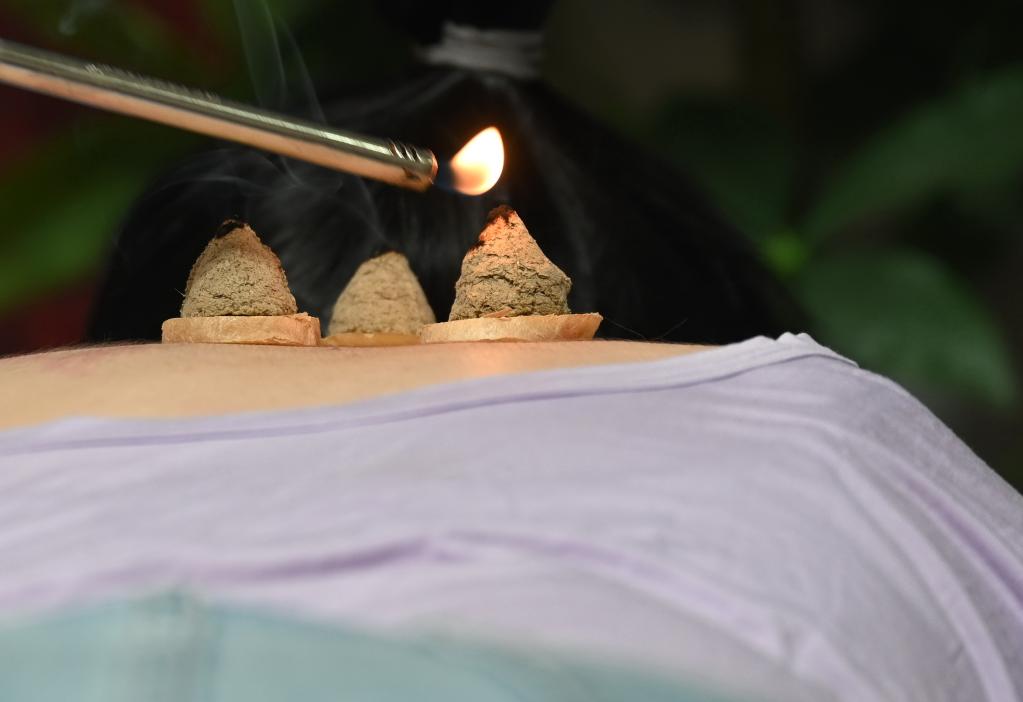 2021年7月11日,患者在瑞來春堂福州三坊七巷中醫館接受“三伏灸”中醫治療。新華社記者 林善傳 攝