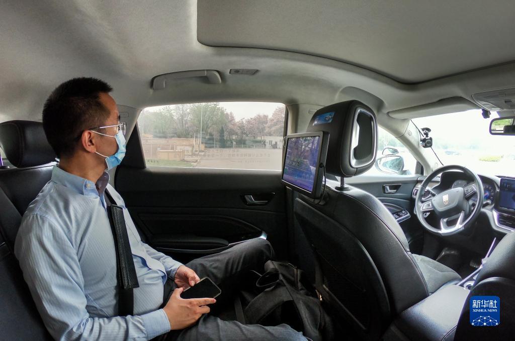 在北京經濟技術開發區,一名乘客在體驗“主駕無人、副駕駛配備安全員”的無人駕駛車(2022年4月25日攝)。新華社記者 彭子洋 攝