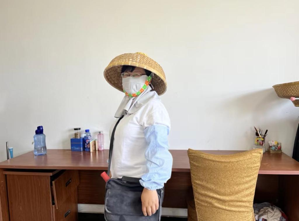 上午10點,熱浪洶涌,水稻田里已經燙得無法下腳。回到室內,周紅英滿身的泥土,身體冒著熱氣。盡管全副武裝,包裹嚴實,她的臉還是被曬得黑里透紅。“流汗太多,防曬霜被洗掉了。”