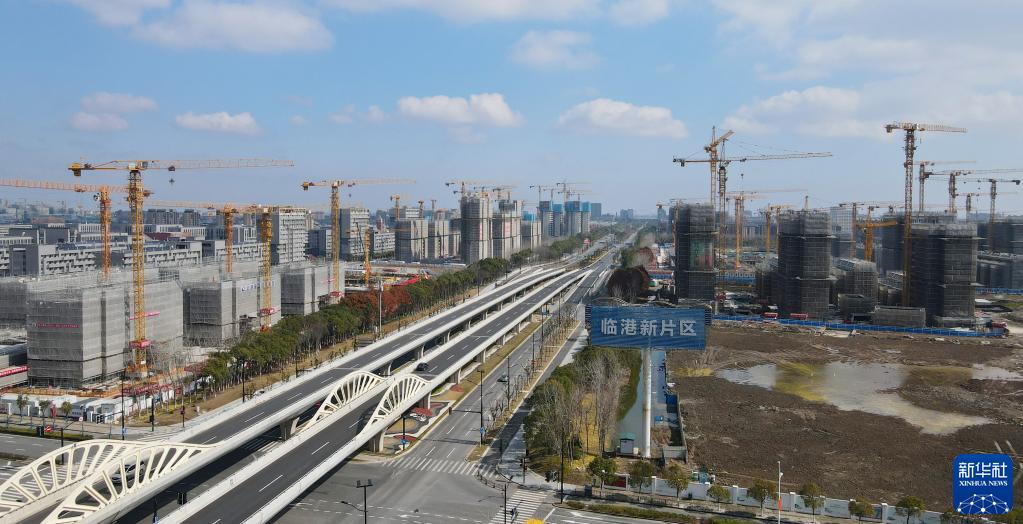 在中國(guó)(上海)自由貿(mào)易試驗(yàn)區(qū)臨港新片區(qū)拍攝的住宅區(qū)建設(shè)現(xiàn)場(chǎng)(2022年2月10日攝,無(wú)人機(jī)照片)。新華社記者 方喆 攝