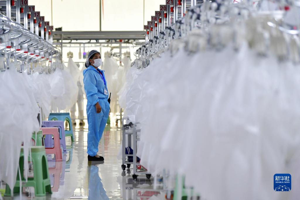 在甘肅省臨夏回族自治州積石山保安族東鄉族撒拉族自治縣,依托東西部扶貧協作平臺引進的服裝加工企業甘肅拓奇扶貧車間的員工在服裝加工生產線上作業(2020年8月9日攝)。新華社記者 陳斌 攝