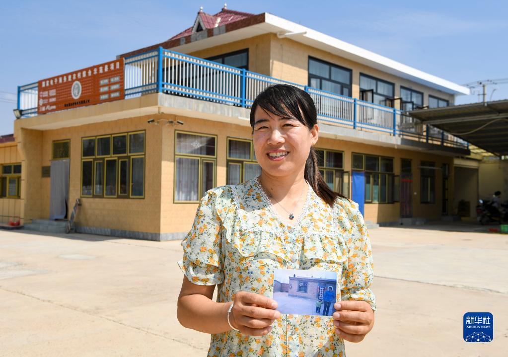 2022年8月4日,寧夏吳忠市紅寺堡區新莊集鄉白墩村村民王航弟在自家二層樓房前。她手里拿著的是10多年前住房的照片。新華社記者 馮開華 攝