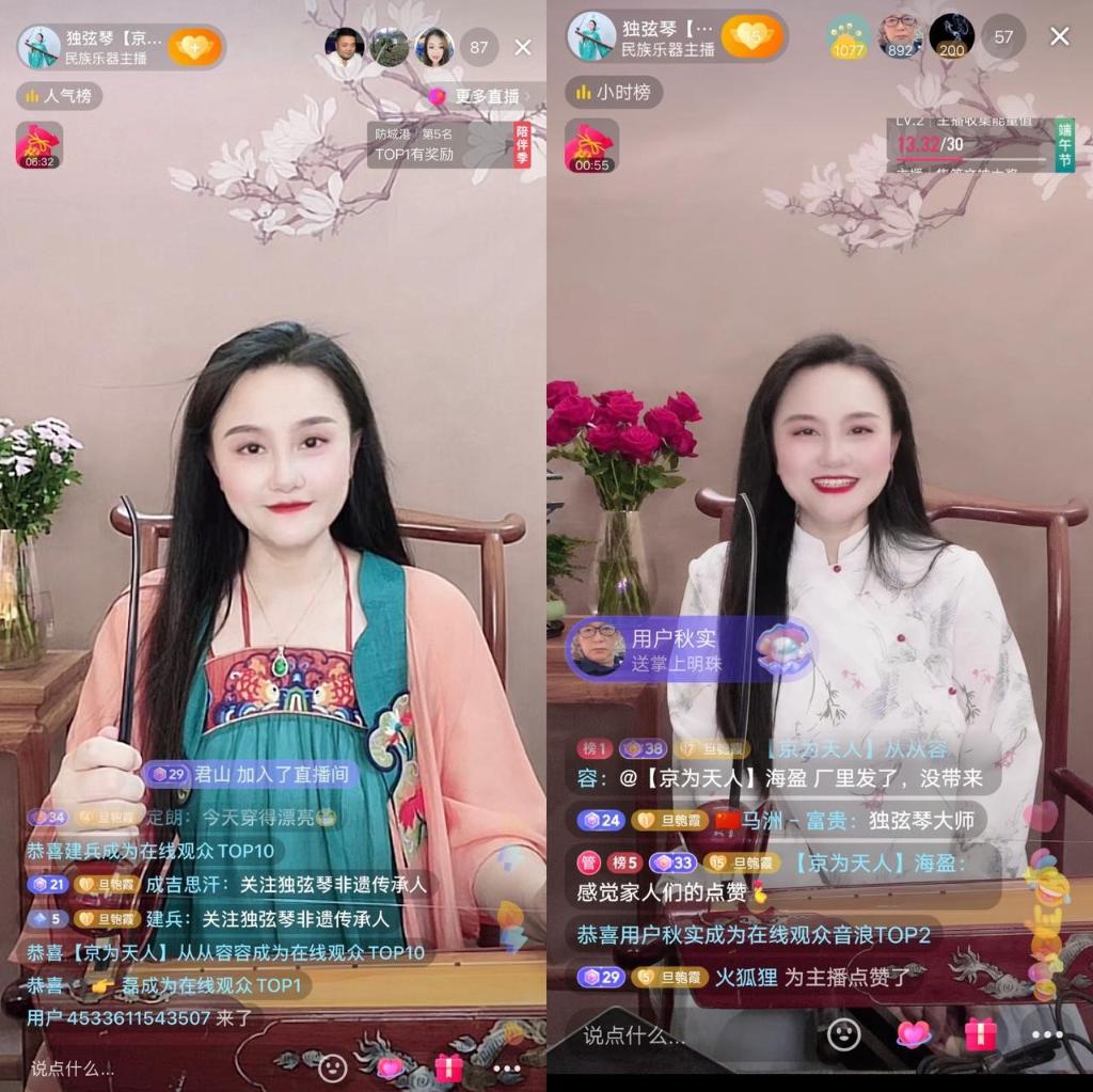 如何讓更多的人認識和傳播獨弦琴藝術(shù)?一次刷手機短視頻的時候,趙霞想到,是否可以借助短視頻直播平臺的傳播力讓更多的人了解獨弦琴?2018年趙霞在抖音平臺注冊了賬號@獨弦琴【京為天人】。剛開始直播時,只會傳統(tǒng)獨弦琴曲目的趙霞面對網(wǎng)友點的流行歌曲,由于自己從沒有編排過,不知如何彈奏。“要想在網(wǎng)上傳播得更好只會傳統(tǒng)曲目不行,必須要改變?!壁w霞每次下播后,都會練習把一些流行歌曲改編成適合獨弦琴演奏的曲調(diào),重新定調(diào)、編排指法,再到直播間演奏。