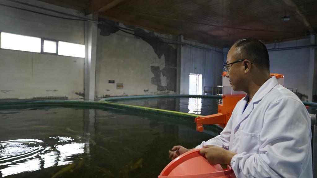 8月8日,青海湖裸鯉救護中心的工作人員為繁育車間里的湟魚喂食。新華社記者陳杰 攝
