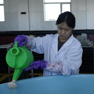 7月6日,青海湖裸鯉救護中心沙柳河泉吉河增殖實驗站的技術(shù)人員在為小魚苗喂食。新華社記者陳杰 攝