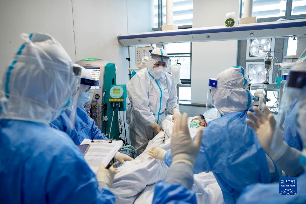 在華中科技大學同濟醫學院附屬同濟醫院中法新城院區ICU病房,北京協和醫院內科重癥醫學科主任杜斌(中)帶領醫療團隊查看一名新冠肺炎危重癥患者情況(2020年4月11日攝)。新華社記者 沈伯韓 攝