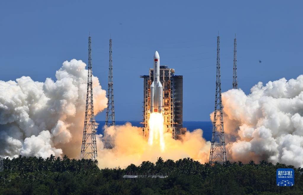 搭載問天實驗艙的長征五號B遙三運載火箭,在我國文昌航天發射場點火發射(2022年7月24日攝)。新華社記者 李剛 攝