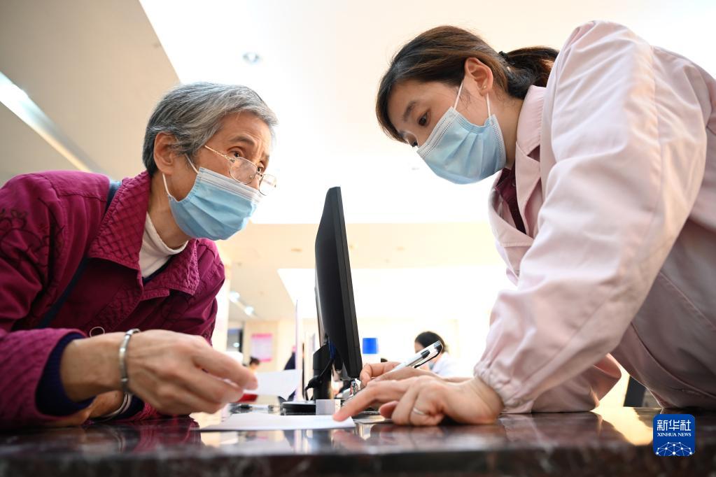 福建省三明市第一醫院的醫保辦工作人員(右)向前來咨詢藥品報銷問題的居民講解相關政策(2020年11月18日攝)。新華社記者 姜克紅 攝