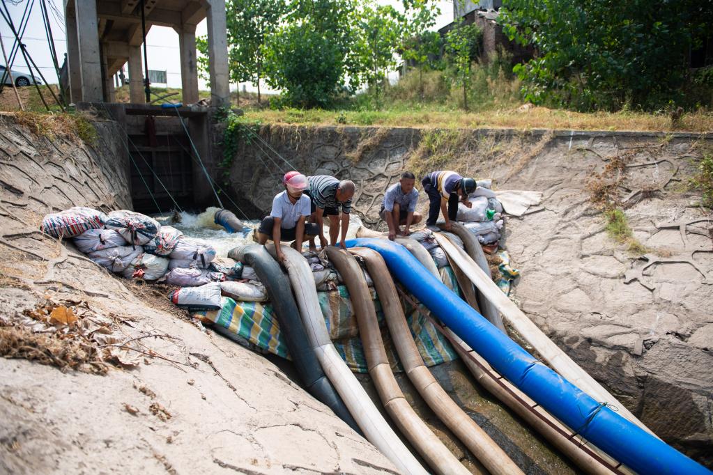 村民在水管站工作人員指導下調整水管位置。新華社記者 陳思汗攝
