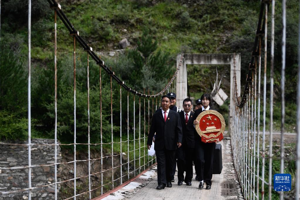 青海省果洛藏族自治州班瑪縣人民法院巡回法庭成員前往班瑪縣燈塔鄉班前村提供法律服務(2021年8月7日攝)。新華社記者 張龍 攝