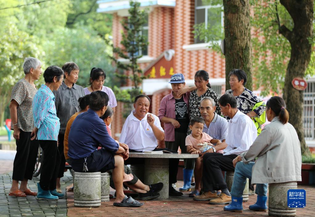 江西蘆溪縣宣風鎮珠亭村人民調解員陽昌紹(中)為珠亭村的百姓宣講民法典知識(2021年8月17日攝)。新華社記者 胡晨歡 攝