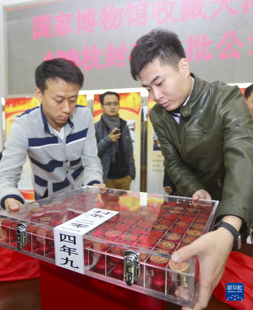 2014年11月15日,國家博物館工作人員搬走天津濱海新區109枚封存審批公章。新華社發(付文超 攝)