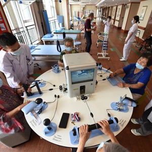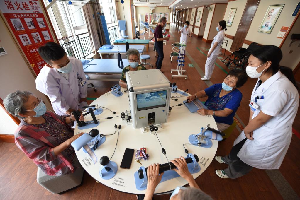 8月5日,在山東日照頤養(yǎng)公寓,醫(yī)生指導(dǎo)老人通過手功能綜合康復(fù)訓(xùn)練平臺進(jìn)行手指鍛煉。新華社記者 范長國 攝