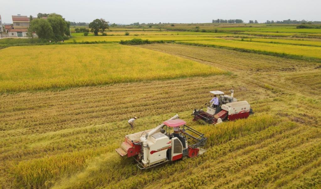 湖北襄陽市襄州區黃龍鎮黃溝村的千畝稻田陸續開始收割。(受訪者供圖)