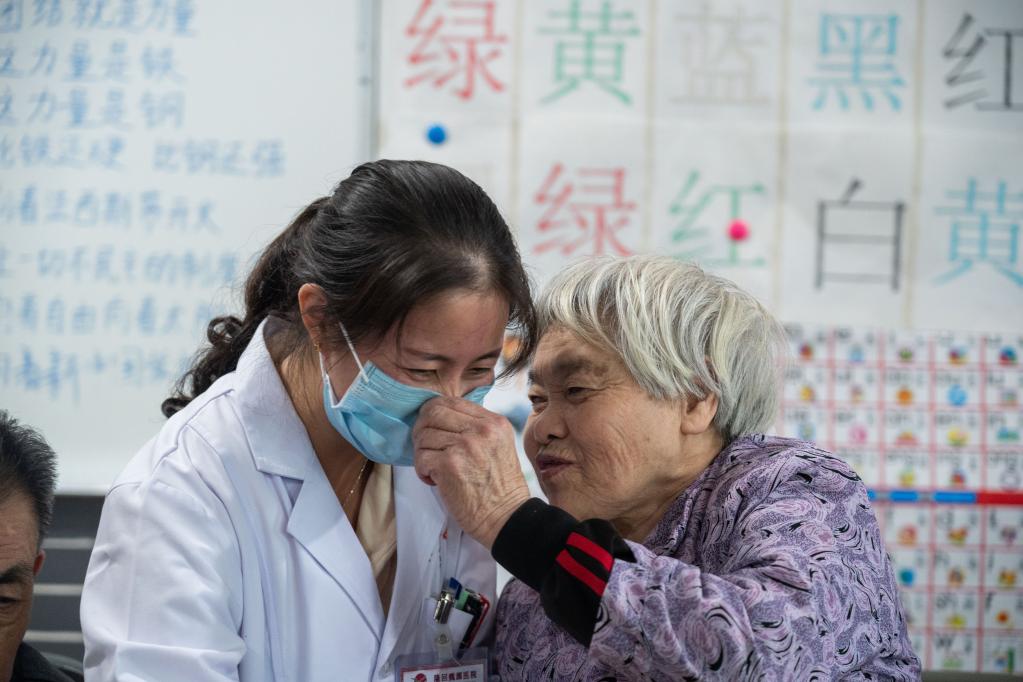 一名老年公寓的老人跟醫護人員親密交流