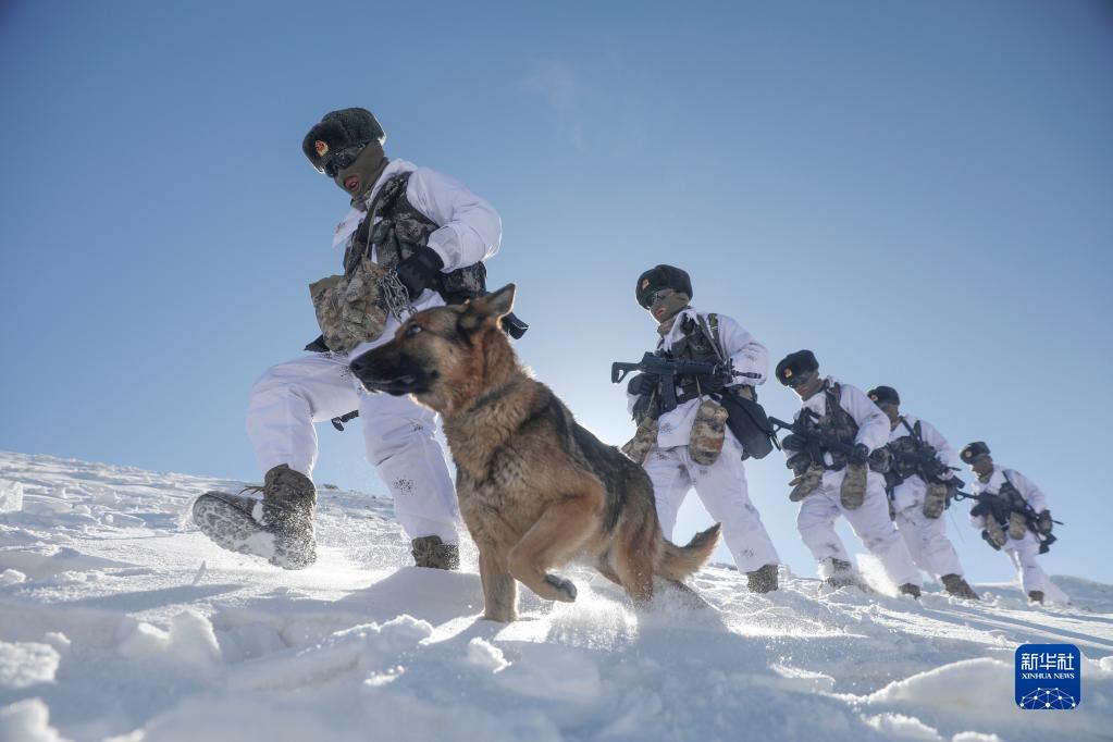 駐守帕米爾高原的新疆喀什軍分區(qū)某邊防團(tuán)托克滿蘇邊防連官兵按計(jì)劃對(duì)海拔5100米的山口實(shí)施例行巡邏(2021年2月11日攝)。新華社發(fā)(姬文志 攝)