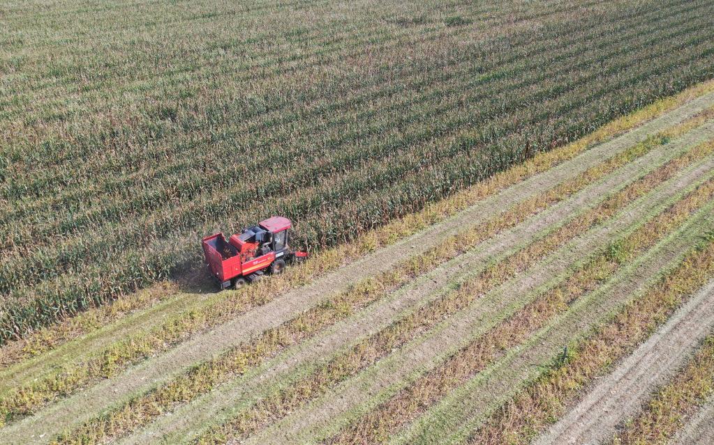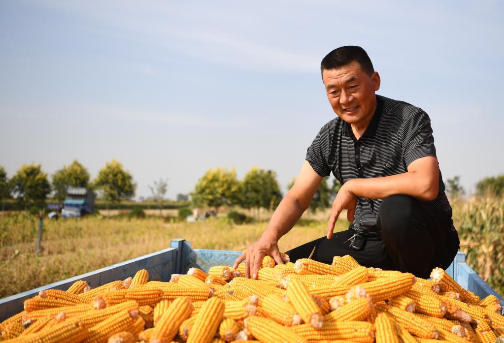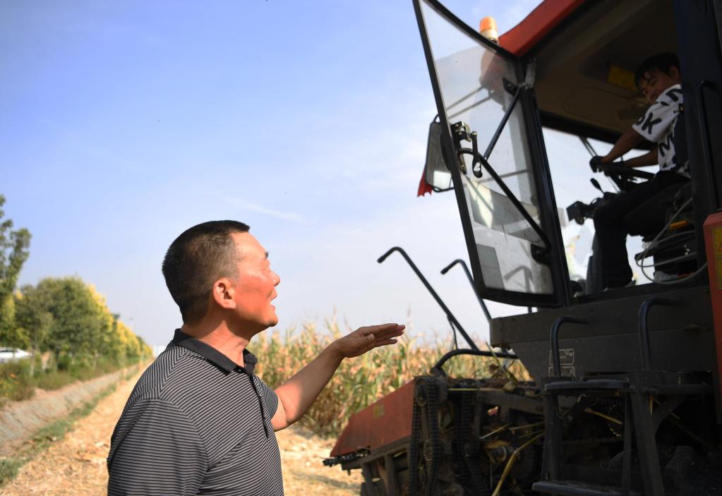 “這是打碎的玉米秸稈的味道,城里可聞不到。”種糧大戶、商水縣楓未種植養(yǎng)殖農(nóng)民專業(yè)合作社的負(fù)責(zé)人邱守先笑著說。瘦高的他,臉上曬得黑里透紅,正在地頭看玉米收割機(jī)卸貨,金黃色的玉米棒滾落著裝滿了一輛小四輪拖拉機(jī)。