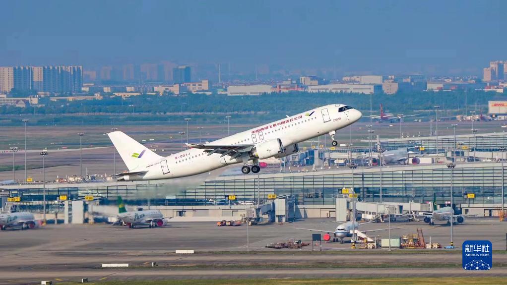 2022年5月14日6時52分,編號為B-001J的C919大飛機(jī)從上海浦東機(jī)場第4跑道起飛,于9時54分安全降落,標(biāo)志著中國商飛公司即將交付首家用戶的首架C919大飛機(jī)首次飛行試驗圓滿完成。新華社發(fā)