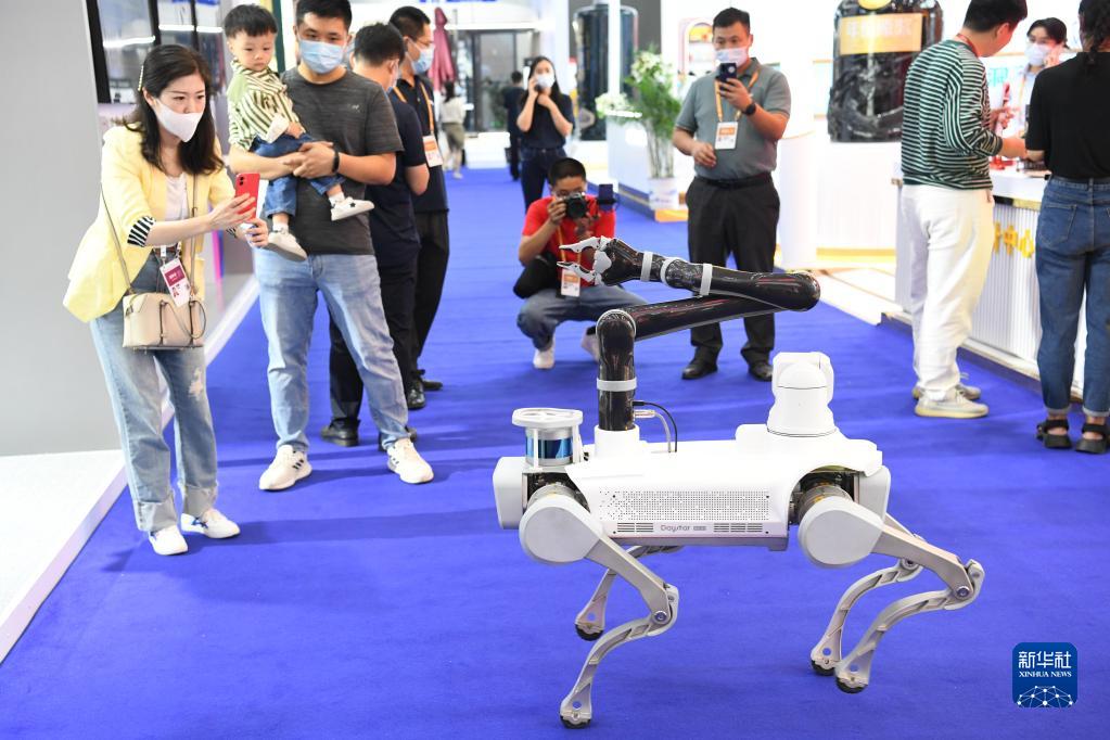 參觀者在安徽合肥舉辦的2022世界制造業(yè)大會上拍攝展出的一款四足巡檢機(jī)器人(2022年9月20日攝)。新華社記者 張端 攝