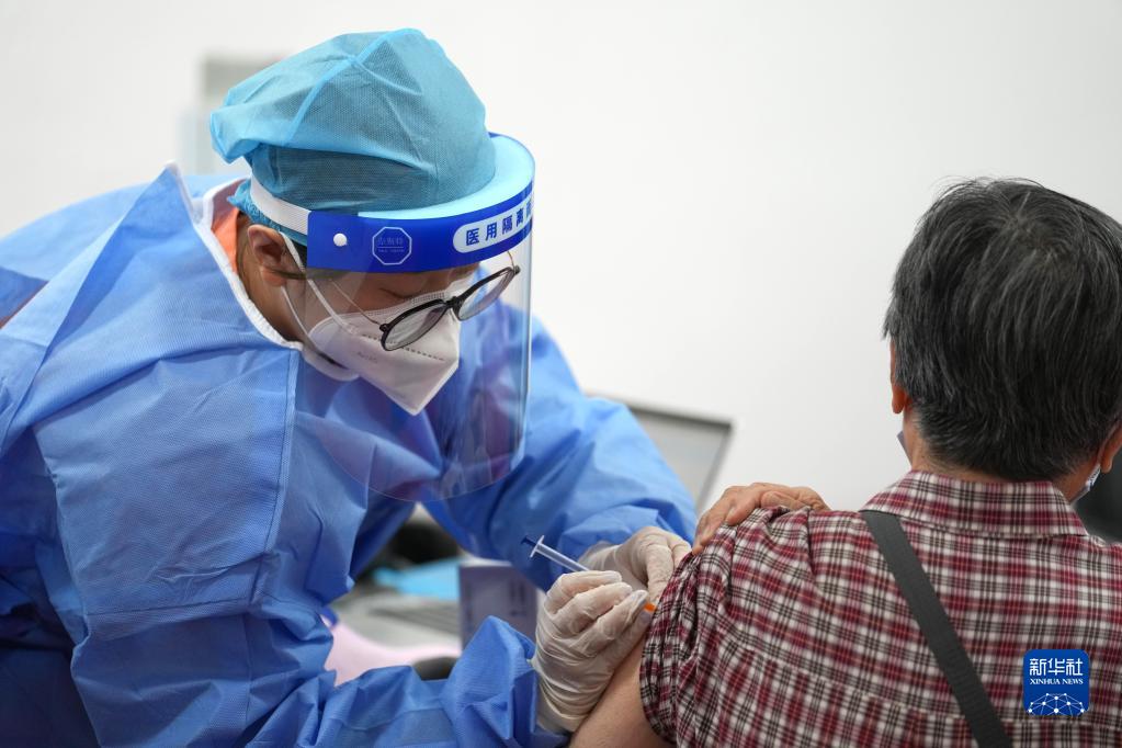 2022年7月13日,在北京市朝陽區(qū)奧運村街道一處新冠疫苗接種點,醫(yī)護(hù)人員為一名86歲的市民接種新冠疫苗加強針。新華社記者 鞠煥宗 攝