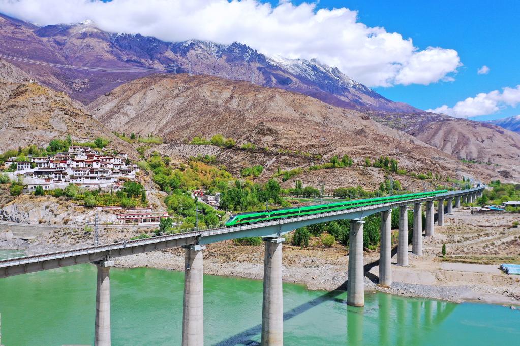 復興號列車行駛在西藏朗縣境內(nèi)(2022年4月14日攝)。 新華社記者 覺果 攝