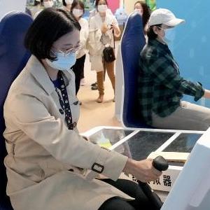 10月7日,觀眾在“奮進新時代”主題成就展上體驗操縱直升機訓練模擬器。當日是國慶長假的最后一天,大批觀眾來到北京展覽館參觀“奮進新時代”主題成就展。新華社記者 王毓國 攝