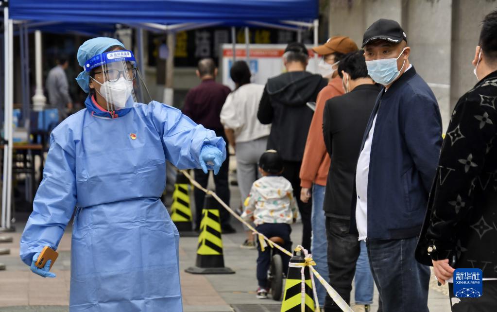共產黨員、北京八里莊街道機關干部張茜(左)在核酸篩查現場進行秩序維護(2022年5月11日攝)。新華社記者 李欣 攝