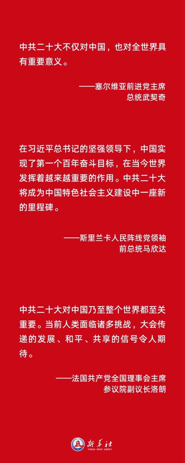 中共二十大,是在全黨全國各族人民邁上全面建設社會主義現代化國家新征程、向第二個百年奮斗目標進軍的關鍵時刻召開的一次十分重要的大會。各國政黨政要在賀電賀函中認為,當今世界充滿不確定性,中共二十大的勝利召開具有里程碑意義,必將對中國和世界產生深遠影響。