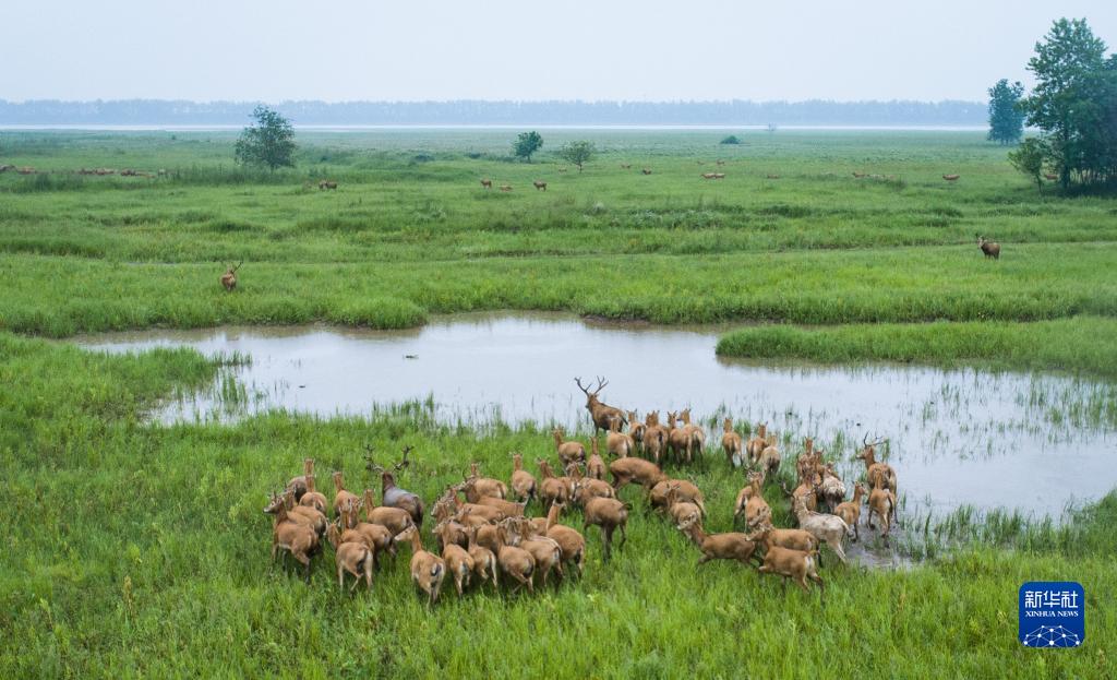 一群麋鹿在湖北石首麋鹿國家級自然保護區內活動(2021年5月17日攝,無人機照片)。新華社記者 肖藝九 攝