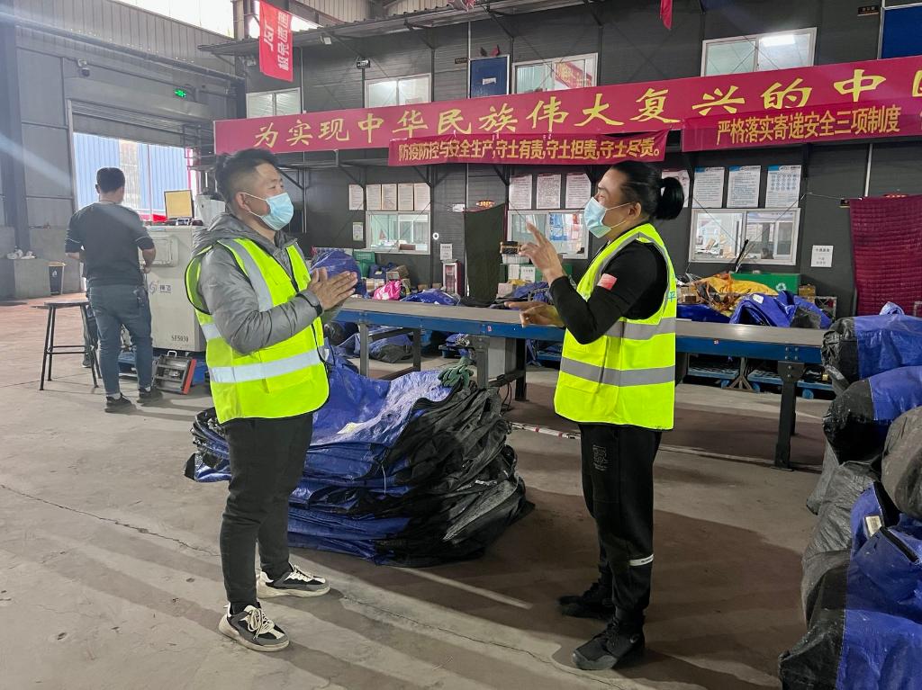 和其他快遞網點不同,在忙碌的身影中,有幾個人穿著亮眼的熒光綠馬甲,在卡車車廂內外專注地搬運快件,不時比劃幾個手勢。