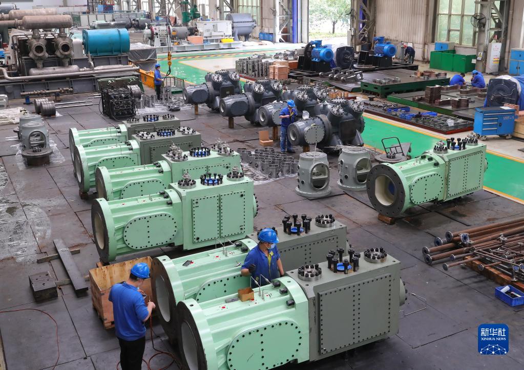 在沈鼓集團,工人在總裝車間工作(2022年6月13日攝)。新華社記者 楊青 攝